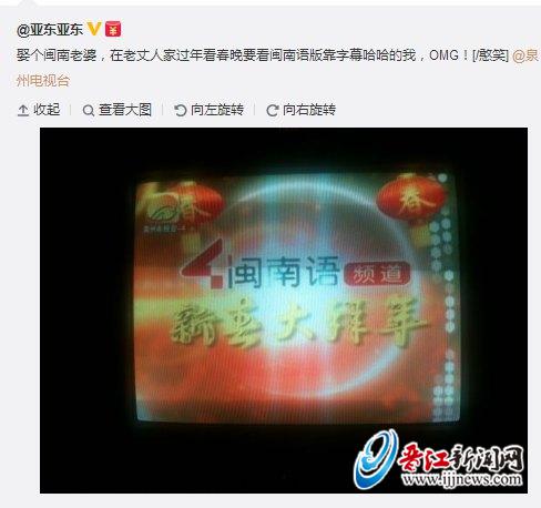 上了年紀(jì)的老人都愛看咱們?nèi)莸?a href="http://www.yyykp.com/wenhua/" target="_blank">閩南語(yǔ)頻道——泉州4套,老丈人家也不例外。2013年的那個(gè)春節(jié),蘇亞東在丈人家過年,當(dāng)全家人圍在一塊兒津津有味地看著閩南語(yǔ)春晚時(shí),他只能盯著字幕看才看得懂。“這是兩年前在晉江過春節(jié)的最深印象。”他戲謔道,“當(dāng)年只能靠看字幕呵呵的我,現(xiàn)在依舊還得看字幕。”