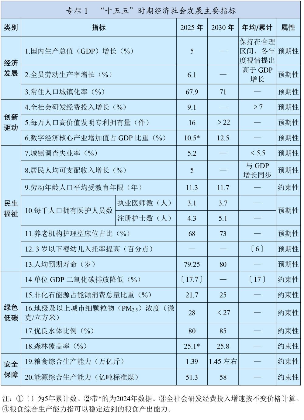 新發(fā)展理念引領(lǐng)作用全面彰顯,構(gòu)建新發(fā)展格局邁出重要步伐,新質(zhì)生產(chǎn)力穩(wěn)步發(fā)展,高質(zhì)量發(fā)展扎實(shí)推進(jìn)。經(jīng)濟(jì)運(yùn)行穩(wěn)中有進(jìn),國內(nèi)生產(chǎn)總值突破140萬億元,現(xiàn)代化產(chǎn)業(yè)體系建設(shè)取得重大進(jìn)展,基礎(chǔ)設(shè)施支撐能力不斷提升,數(shù)字經(jīng)濟(jì)核心產(chǎn)業(yè)增加值占比超過10.5%,城鄉(xiāng)區(qū)域發(fā)展平衡性協(xié)調(diào)性增強(qiáng)??萍紕?chuàng)新成果豐碩,全社會(huì)研發(fā)經(jīng)費(fèi)投入強(qiáng)度達(dá)到2.8%,攻克一批重大關(guān)鍵核心技術(shù),取得一批重大原創(chuàng)科技成果。全面深化改革進(jìn)一步推進(jìn),落實(shí)“兩個(gè)毫不動(dòng)搖”的體制機(jī)制不斷完善,全國統(tǒng)一大市場(chǎng)建設(shè)取得積極成效,宏觀經(jīng)濟(jì)治理效能進(jìn)一步提升。高水平對(duì)外開放不斷擴(kuò)大,開放型經(jīng)濟(jì)新體制加快形成,高質(zhì)量共建“一帶一路”走深走實(shí)。全過程人民民主深入發(fā)展,全面依法治國有效實(shí)施。文化事業(yè)和文化產(chǎn)業(yè)蓬勃發(fā)展,精神文化產(chǎn)品豐富多彩。民生保障扎實(shí)穩(wěn)固,居民人均可支配收入年均增長(zhǎng)5.4%,城鎮(zhèn)新增就業(yè)累計(jì)達(dá)到6242萬人,勞動(dòng)年齡人口平均受教育年限達(dá)到11.3年,人均預(yù)期壽命提升至79歲以上,脫貧攻堅(jiān)成果鞏固拓展。綠色低碳轉(zhuǎn)型步伐加快,生態(tài)環(huán)境質(zhì)量持續(xù)改善,非化石能源發(fā)電裝機(jī)容量超過化石能源,地級(jí)及以上城市細(xì)顆粒物(PM2.5)濃度降至28微克/立方米,地表水達(dá)到或好于Ⅲ類水體比例超過90%,森林覆蓋率超過25%。國家安全能力有效提升,糧食產(chǎn)量邁上1.4萬億斤大臺(tái)階,社會(huì)治理效能增強(qiáng),社會(huì)大局保持穩(wěn)定。國防和軍隊(duì)建設(shè)取得重大進(jìn)展。“一國兩制”實(shí)踐深入推進(jìn)。中國特色大國外交全面拓展。全面從嚴(yán)治黨成效顯著,反腐敗斗爭(zhēng)縱深推進(jìn),黨的創(chuàng)造力、凝聚力、戰(zhàn)斗力明顯提高。