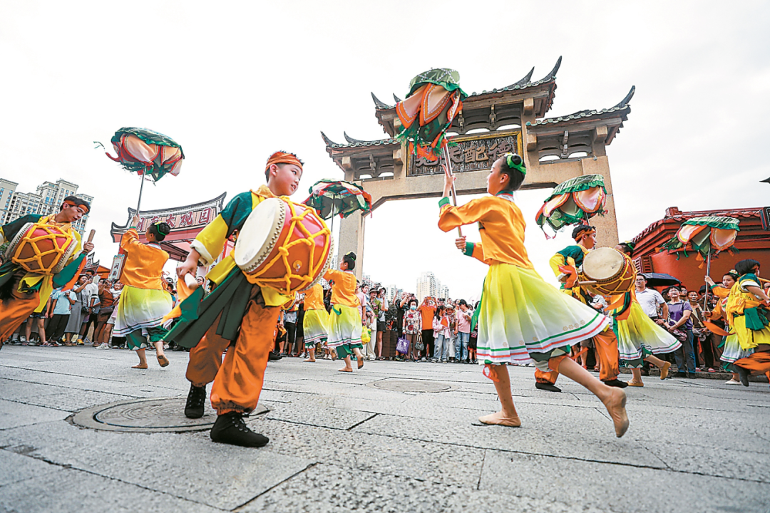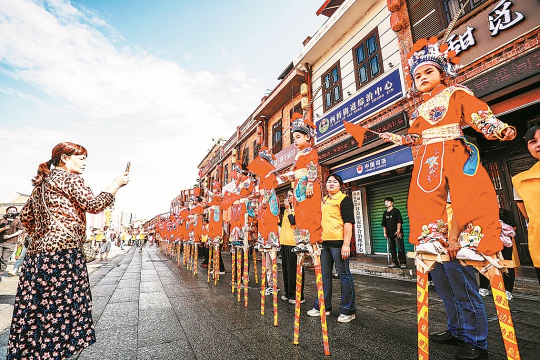 國慶期間,大鼓涼傘在漳州古城表演。 鄭文典 攝