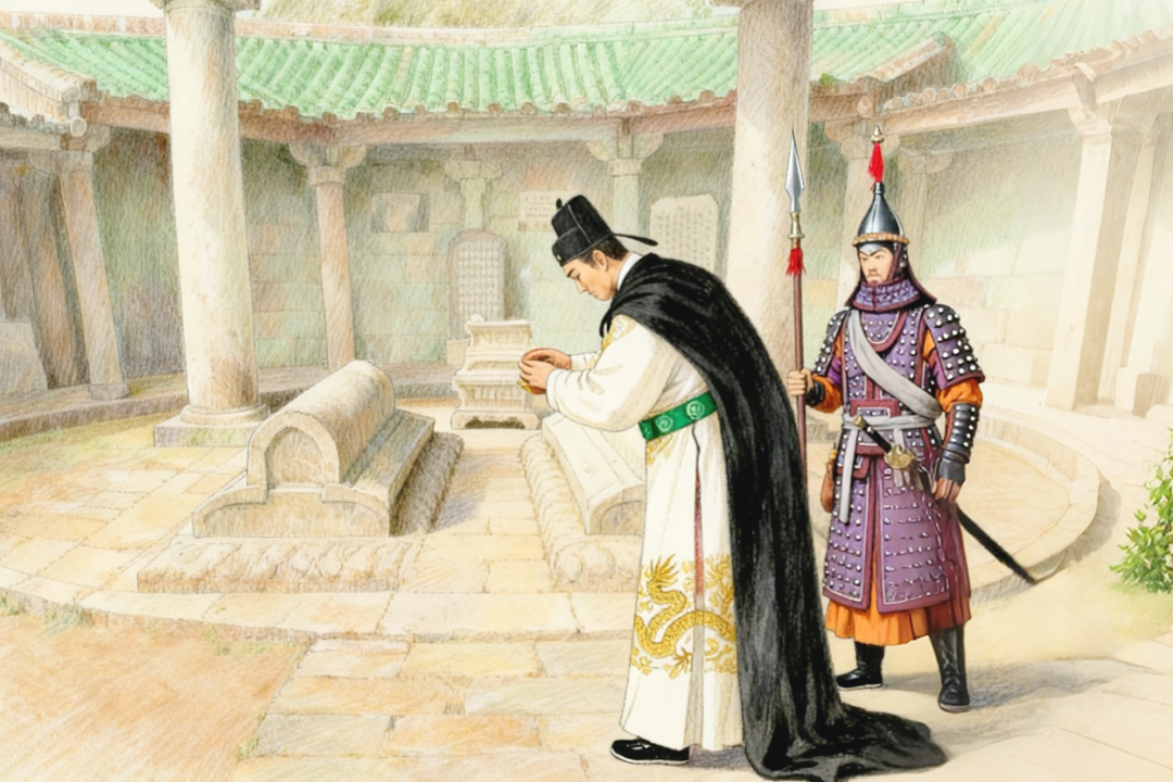 明永樂十五年,航海家鄭和第五次下西洋前,專程到靈山圣墓行香進謁、祈求庇佑。(AI制圖)