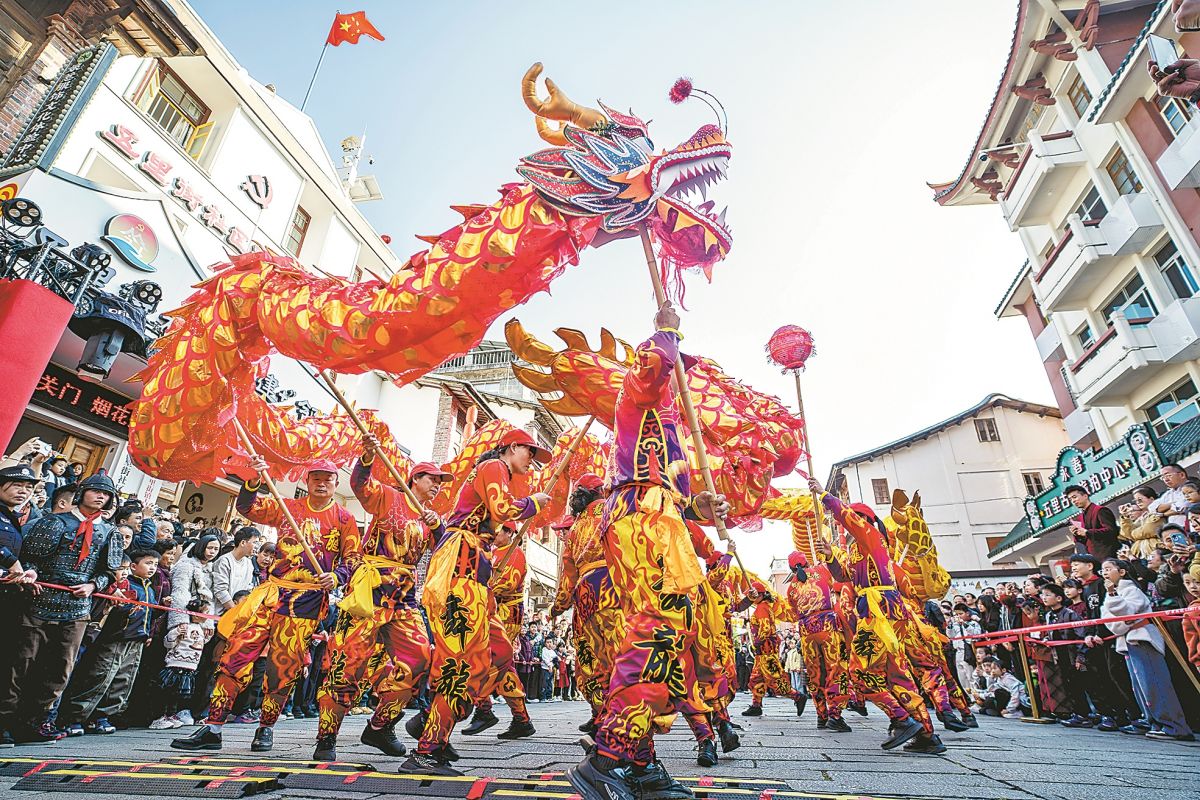2月18日,永春五里古街舉行非遺秀,舞獅、舞龍(如圖)、白鶴拳等七大方陣踏街巡游,吸引眾多市民游客前來觀賞。本報(bào)通訊員 康慶平 攝