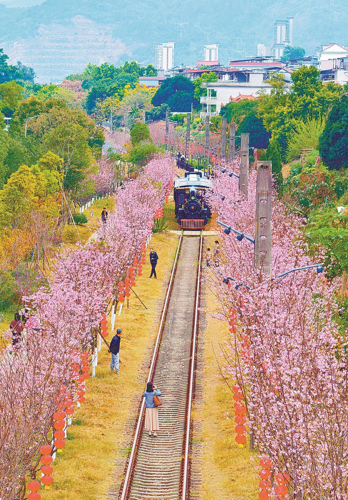 2月18日,游客在三明沙縣鐵路公園坐觀光火車、賞櫻花。本報(bào)通訊員 俞和江 攝