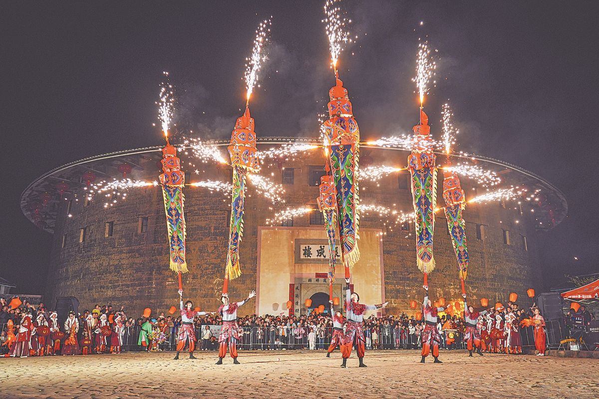 2月18日,游客在龍巖永定土樓欣賞美景,觀看非遺演出。本報(bào)通訊員 章宸睿 黃緣桂 攝