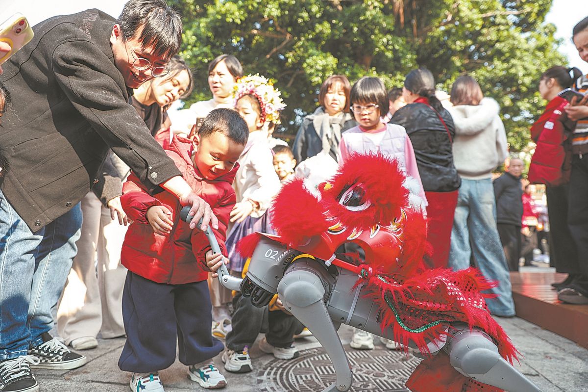2月21日,機(jī)器狗亮相漳州古城,與八方游客零距離互動(dòng),大人小孩開心不已。鄭文典 攝