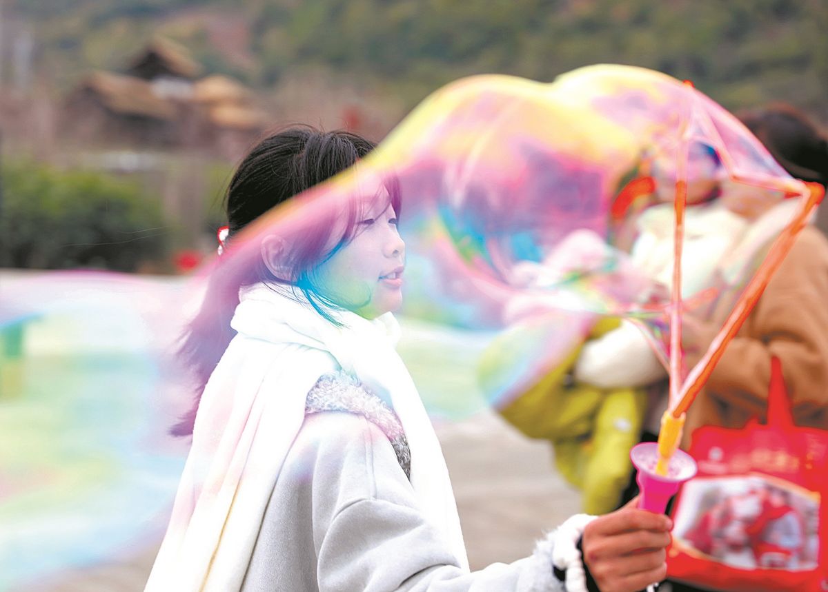 2月18日,南平市政和縣石圳景區(qū),市民們走出家門來到戶外賞景、嬉戲、休憩,品嘗美食,樂享年味。黃杰敏 攝
