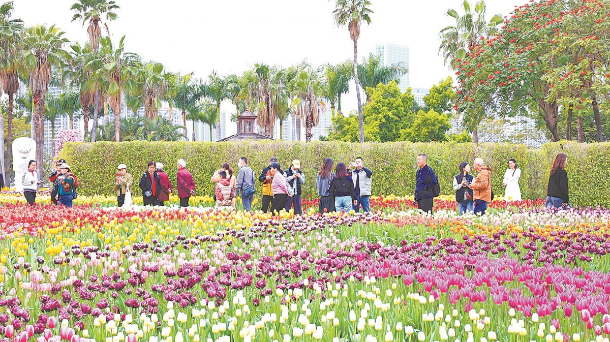 2月18日,游客們在廈門園博苑欣賞郁金香花展。春節(jié)期間,13.6萬株郁金香綻放,為春節(jié)的廈門帶來勃勃生機(jī)。李嫻鳳 攝