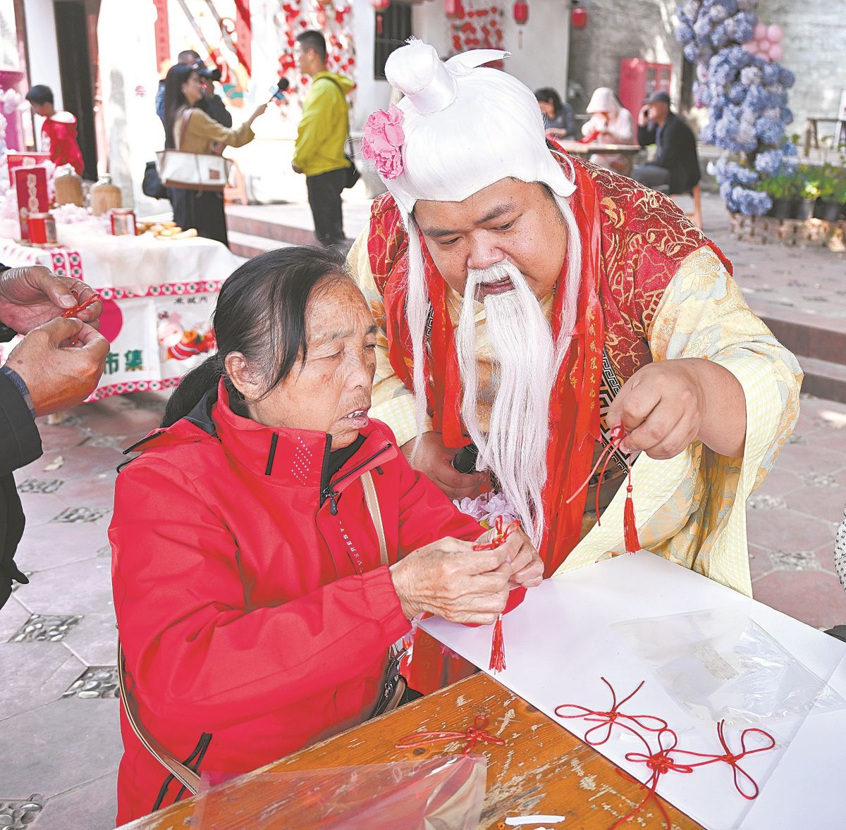 2月22日,廈門市集美區(qū)城內(nèi)社,“馬到厝邊·趣祈福”新春年俗活動(dòng)熱鬧上演,村民、臺(tái)胞與游客歡聚在一起,沉浸式體驗(yàn)閩南年味,共赴兩岸同歡的新春之約。圖為身著月老形象服裝的臺(tái)青現(xiàn)場指導(dǎo)游客制作中國結(jié)。林志杰 攝