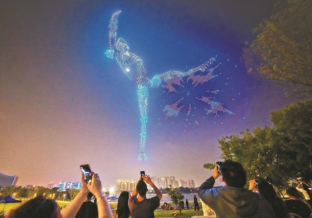 4月28日,福州市閩侯縣旗山湖上空,3333架無人機編隊演繹了一場數(shù)字中國建設(shè)峰會主題光影秀。 福建日報記者 施辰靜 攝