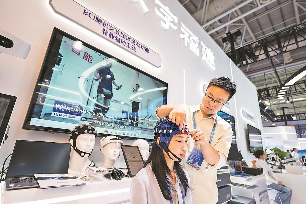 4月28日,在數(shù)字福建展區(qū),福建致遠科創(chuàng)的工作人員正在演示用于康復(fù)訓(xùn)練的BCI腦機交互肢體運動功能智能輔助系統(tǒng)。福建日報記者 施辰靜 攝