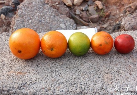 記者從贛州不同工廠帶回六個(gè)橙子,只有中間綠色的橙子沒有經(jīng)過處理,最左邊和最右邊的橙子被檢測出果皮含有蘇丹紅