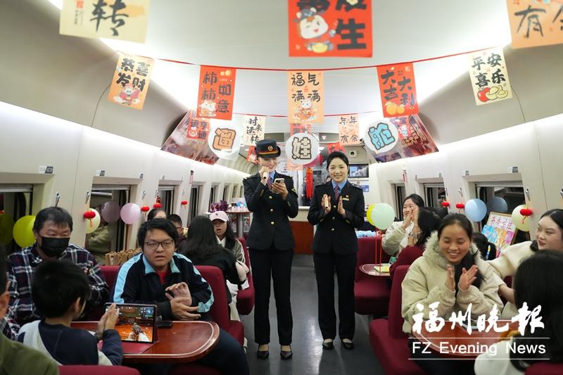 長(zhǎng)編列車“遛娃艙”很熱鬧,充滿節(jié)日氛圍。