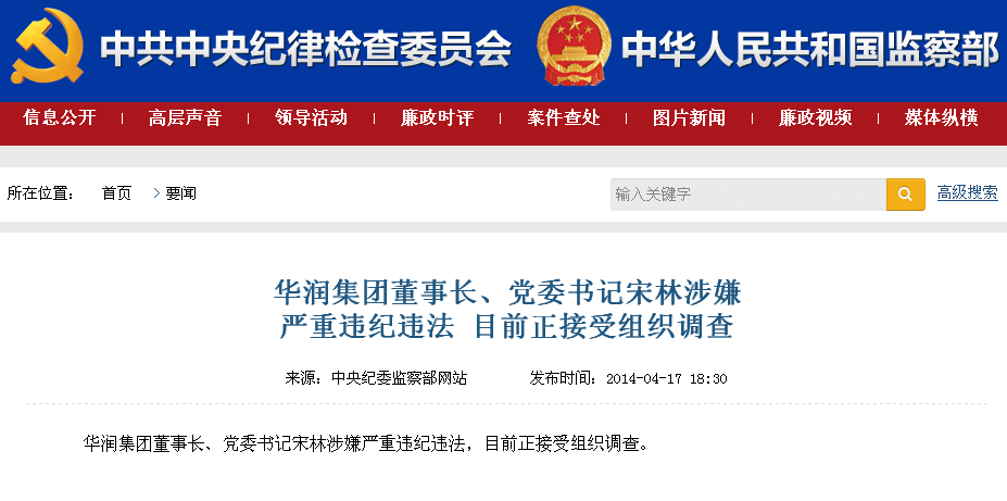 4月17日消息,據(jù)中央紀委監(jiān)察部網(wǎng)站消息,華潤集團董事長、黨委書記宋林涉嫌嚴重違紀違法,目前正接受組織調(diào)查。