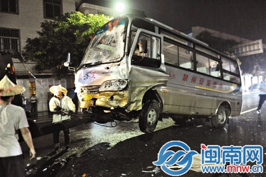 昨晚7點(diǎn)多,海都記者第一時(shí)間趕到現(xiàn)場(chǎng)。事發(fā)路段是雙向6車道,路中央有5截護(hù)欄被撞沒。泉州往安溪方向的車道上,一輛閩CT33××的出租車,橫在路中,車的右側(cè)部位和車頭嚴(yán)重變形。一輛閩CY38×ד泉州—安溪”的中巴車,車頭對(duì)著出租車,前窗玻璃開裂嚴(yán)重,車頭下盤和駕駛室被撞凹。