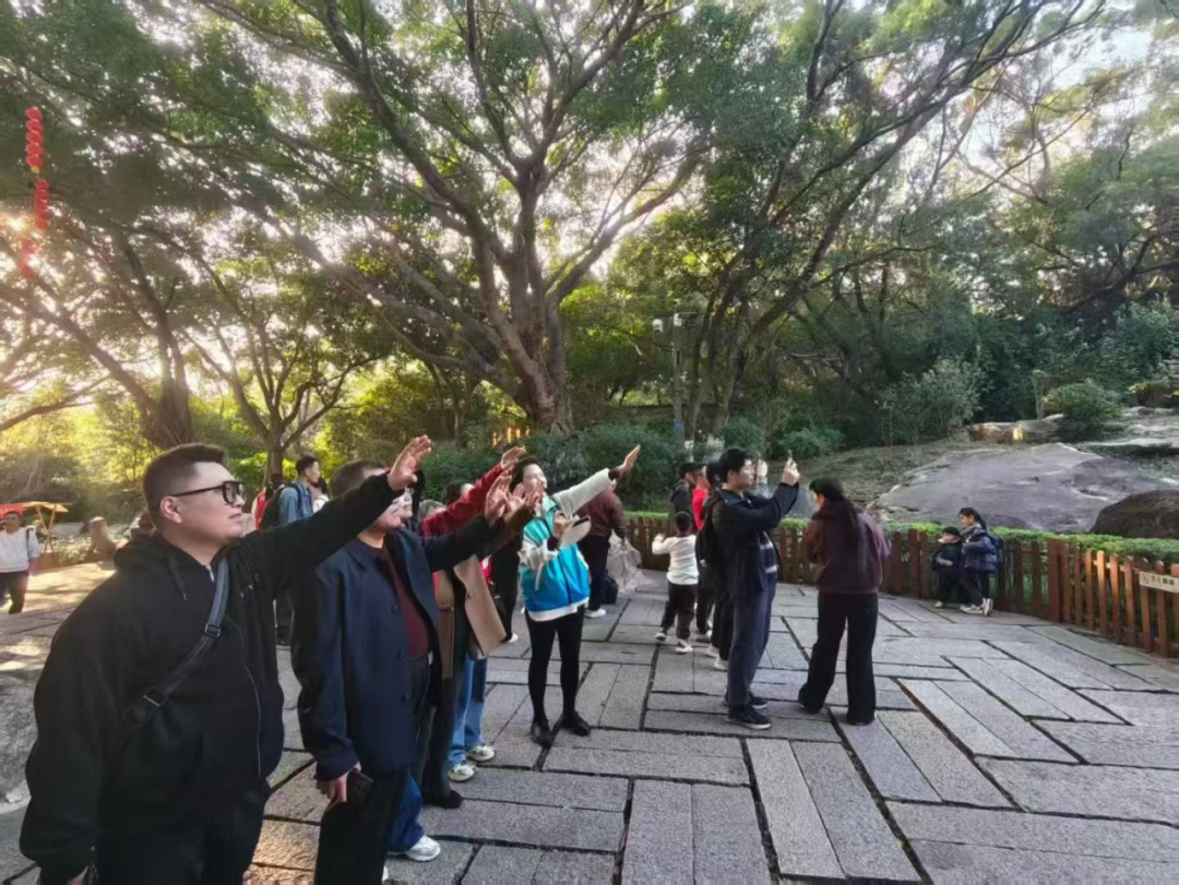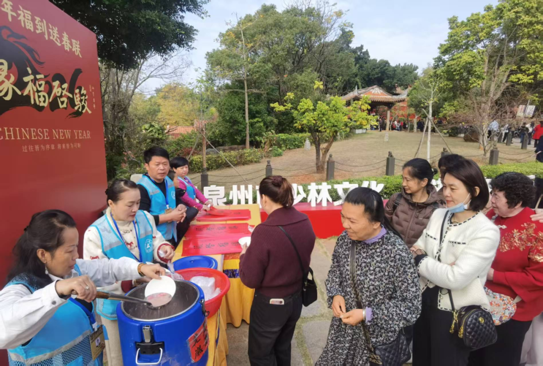 在泉州少林寺,武僧們的精彩表演引得陣陣喝彩,而在表演場外,公益講解員也忙碌不停,協(xié)助分發(fā)春聯(lián)、贈粥送暖,用生動的語言為游客講述南少林禪武文化的源遠流長,讓游客在感受功夫魅力的同時,更深入理解其背后的文化根脈。