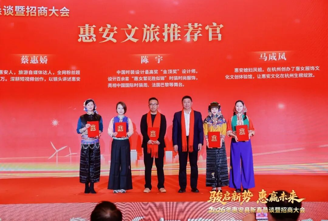 在聘任環(huán)節(jié),縣委副書記、縣人大常委會(huì)主任陳劍鋒分別為張炳煌、楊偉平、盧聰海等8位新聘“招商大使”授牌,縣委常委、宣傳部部長(zhǎng)劉東升分別為陳宇、蔡惠嬌、馬成鳳、馬蕎茵、李開(kāi)白5位“文旅推薦官”頒牌。這批深耕行業(yè)領(lǐng)域、擁有豐富資源的“代言人”,既有行業(yè)領(lǐng)軍企業(yè)家,也有全網(wǎng)粉絲超千萬(wàn)的自媒體達(dá)人,還有國(guó)家級(jí)時(shí)裝設(shè)計(jì)最高獎(jiǎng)得主,他們將充分發(fā)揮自身優(yōu)勢(shì),積極宣傳惠安、推介惠安,成為惠安鏈接優(yōu)質(zhì)項(xiàng)目、招才引智的“最強(qiáng)外腦”,為家鄉(xiāng)招商引資、招才引智牽線搭橋、建言獻(xiàn)策。