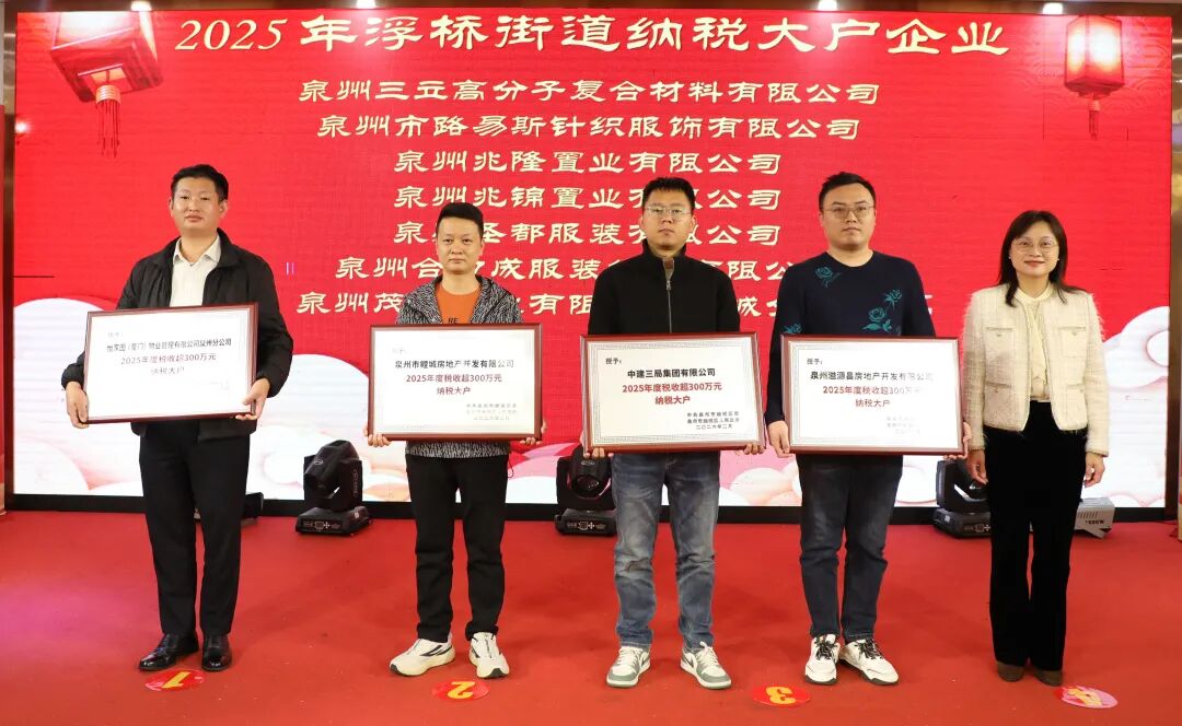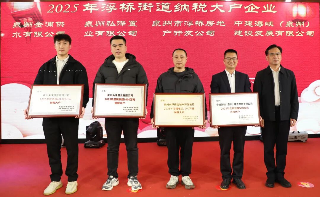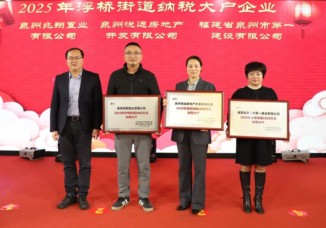 活動(dòng)期間,浮橋街道還為泉州兆翔置業(yè)有限公司、泉州悅遠(yuǎn)房地產(chǎn)開(kāi)發(fā)有限公司、福建省泉州市第一建設(shè)有限公司、泉州金浦供水有限公司等2025年度納稅大戶(hù)企業(yè)代表頒發(fā)牌匾,感謝他們?yōu)閰^(qū)域經(jīng)濟(jì)發(fā)展做出的積極貢獻(xiàn)。