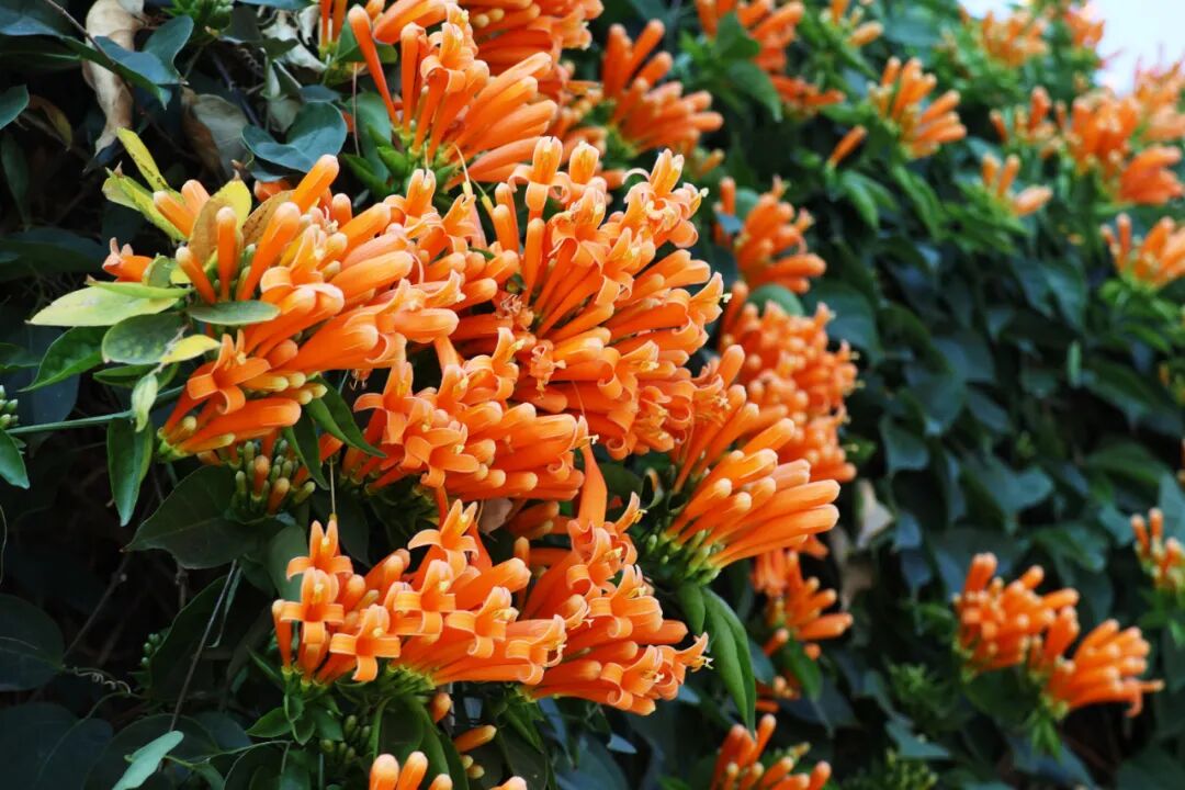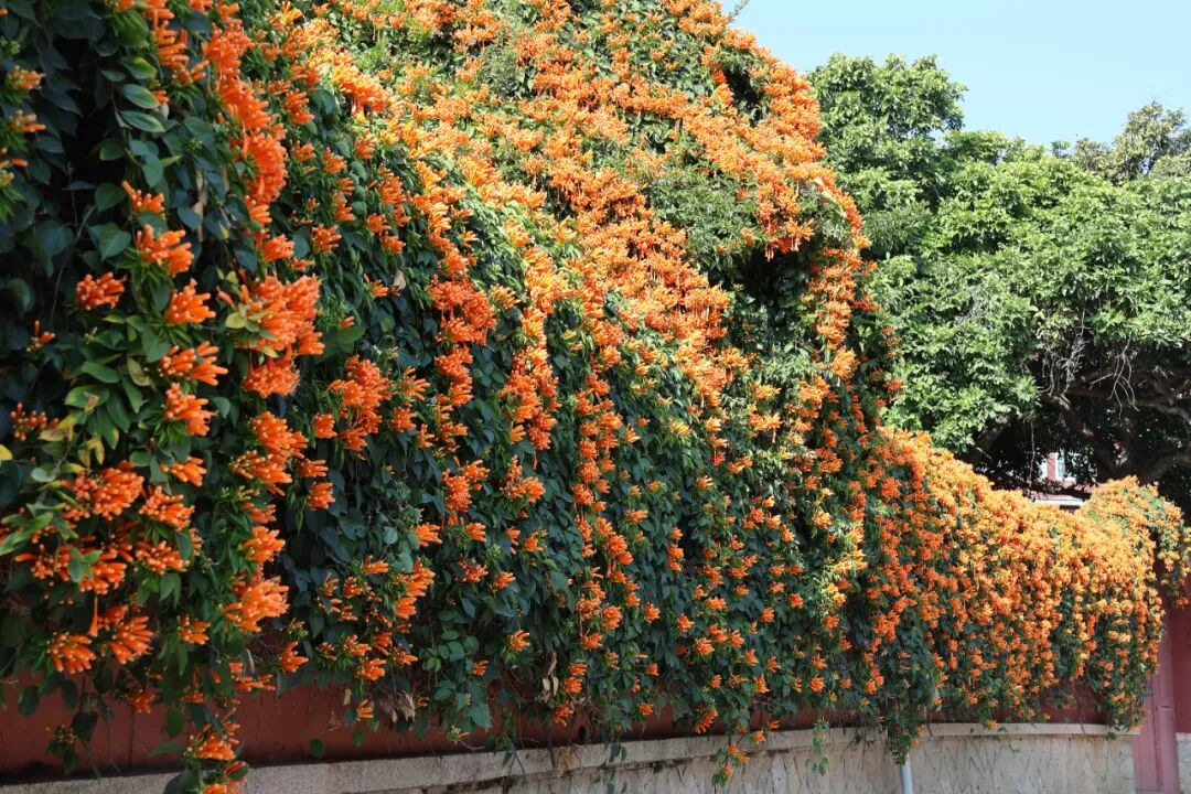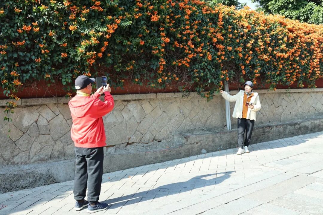 走近細(xì)看,每一串花穗都由數(shù)十朵筒狀小花組成,緊密排列,看起來像是喜慶的鞭炮串。這些炮仗花每年春節(jié)前后進(jìn)入盛花期,恰好與農(nóng)歷新年相呼應(yīng),象征著紅火新年,為這條古街與古跡增添了濃濃的節(jié)日氛圍。