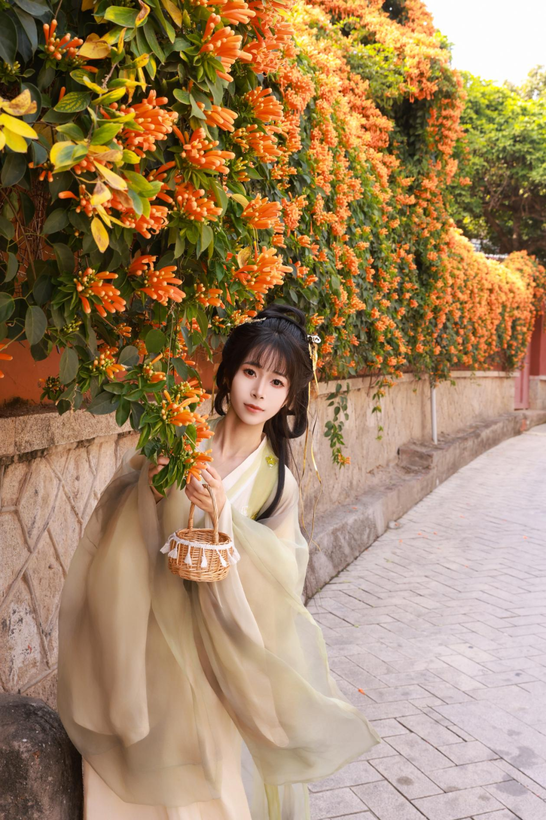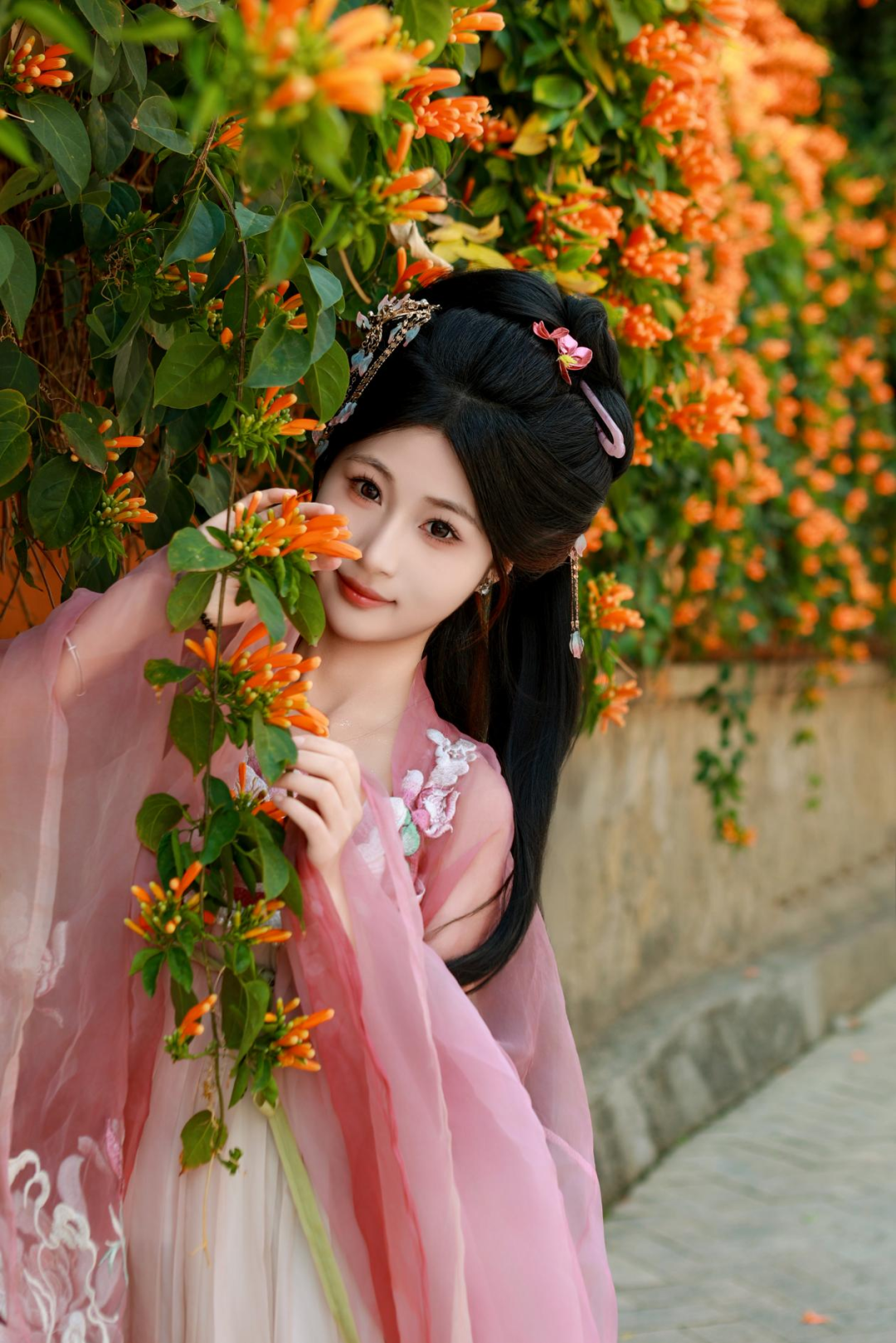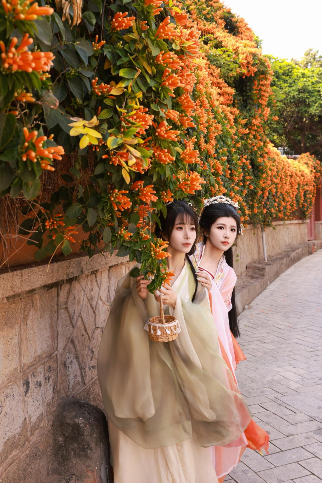 還有不少年輕姑娘盛裝出席,她們身著傳統(tǒng)服飾在花墻前擺出各種姿勢,尋找最佳的拍照角度,身上的漢服與古墻、橙花相映成趣,氛圍感拉滿。