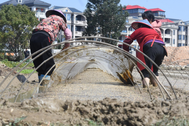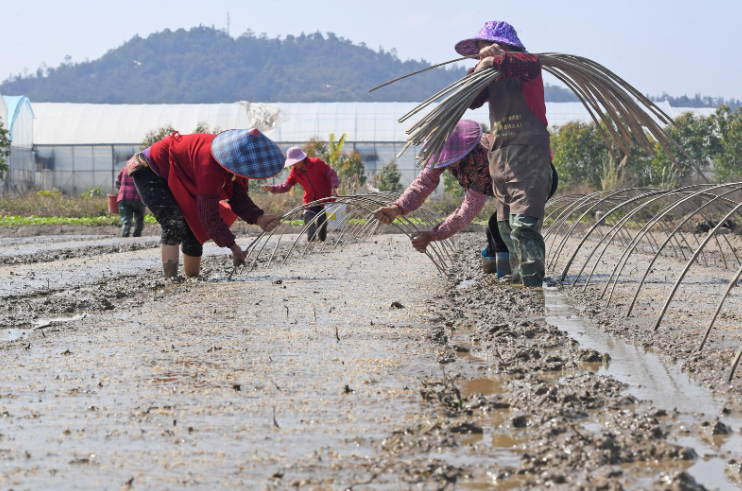 2026年3月10日,在福建省泉州市泉港區(qū)鳩林村早稻育秧基地,稻農(nóng)正在給育秧田架設(shè)覆膜支架。