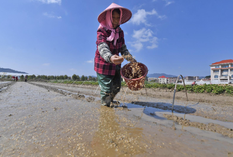 2026年3月10日,在福建省泉州市泉港區(qū)鳩林村早稻育秧基地,稻農(nóng)正在進(jìn)行灑種育秧作業(yè)。