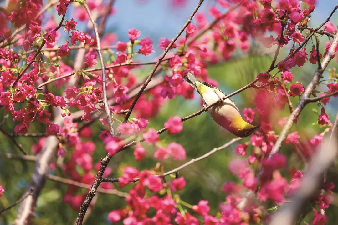 風(fēng)爐山公園的櫻花,粉艷艷的花瓣在藍(lán)天下舒展綻放。鳥兒在樹枝間跳來跳去,啄食著花蕊里的蜜,小巧的身影和粉花湊在一塊,把春天的靈勁兒都定格在了鏡頭里。