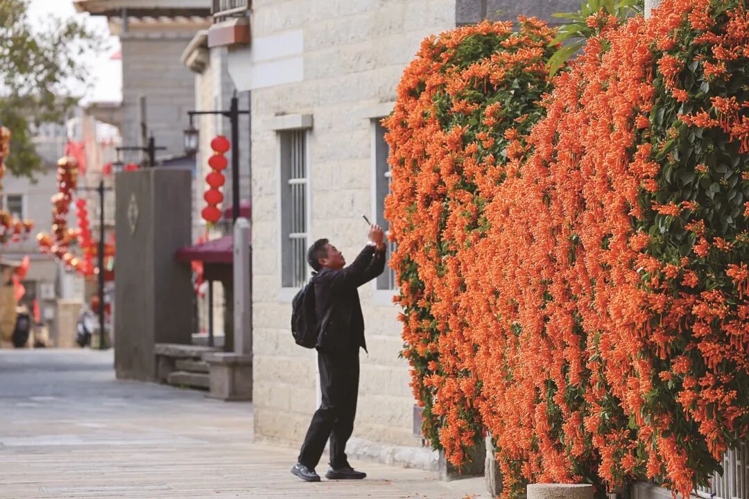 永寧老街上,橙紅的炮仗花順著石墻往下垂,一串接著一串,像掛了滿墻的小鞭炮。游客站在花下拍照,老街的石板路、老房子,與這熱熱鬧鬧的花簇?fù)碓谝黄穑瑹熁饸獗愀懔恕?/p>