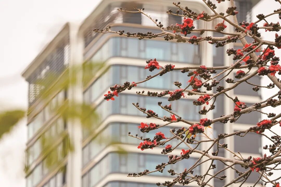 高樓底下,木棉花也開了。光禿禿的枝丫上,艷紅的花骨朵兒立在梢頭,與身后的玻璃幕墻相映成趣,倒也好看。