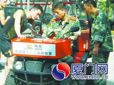 廈港消防中隊中隊長向記者介紹了這臺裝置的特點。說得通俗些,這就是一部前后各安裝一只水箱的沙灘摩托車,“吃”的是柴油,前后兩水箱相通,車后安裝了消防卷盤和水泵,卷盤一頭連接水箱,一頭則連接水槍。通過摩托車引擎發(fā)動,現(xiàn)有水箱容量可滅火10分鐘以上,若持續(xù)補水可以滅火30分鐘以上,水箱可以切換成泡沫或清水模式,水槍頭可切換為直流、開花或噴霧模式。他介紹,現(xiàn)行市面上的小型車車載式細水霧系統(tǒng),全部需要再載附一顆獨立消防泵浦,并非是正統(tǒng)PTO(單一引擎轉(zhuǎn)換驅(qū)動)系統(tǒng)的消防車,所以須有額外的保養(yǎng)工序。這樣的微型消防車采用高壓細水霧和泡沫藥劑雙效功能,具有機動性強、滅火快等特點,能快速抵達現(xiàn)場,10秒內(nèi)即可投入滅火工作,特別適合山地村莊、居住社區(qū)、大型工廠等的消防工作。