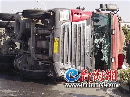 昨日下午1點(diǎn)左右,翔安西路同美村路段,一輛集裝箱車(chē)與一輛貨車(chē)相撞后側(cè)翻,司機(jī)被卡在駕駛室,附近群眾砸破擋風(fēng)玻璃幫司機(jī)脫困。