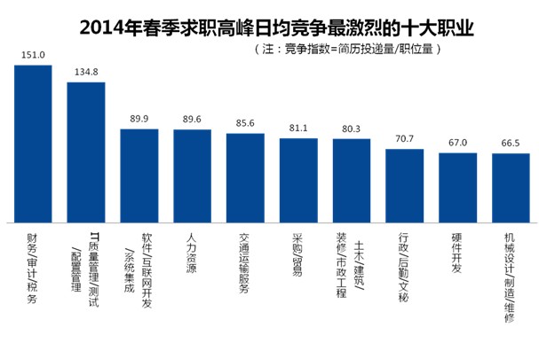 智聯(lián)招聘在線數(shù)據(jù)顯示,從各職業(yè)的競爭情況來看,競爭最為激烈的職業(yè)是財務(wù)/審計/稅務(wù)、IT質(zhì)量管理/測試/配置管理、軟件/互聯(lián)網(wǎng)開發(fā)/系統(tǒng)集成,這三個職業(yè)的競爭指數(shù)分別為151.0,134.8,89.9。尤其是財務(wù)/審計/稅務(wù),平均近100人競爭一個崗位,競爭激烈程度近乎白熱化。這一現(xiàn)象的原因在于:財務(wù)/審計/稅務(wù)崗位的人員需求量較小,同時人員流動性較小,造成職位數(shù)量有限;同時人才市場又供應(yīng)了大量的相關(guān)專業(yè)人才,財務(wù)相關(guān)專業(yè)人才一般傾向于從事專業(yè)對口的崗位,從而導(dǎo)致財務(wù)/審計/稅務(wù)崗位的競爭十分激烈。