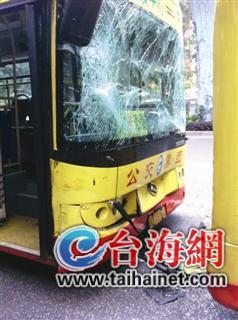 事后林小姐下車一看,原來,后面的36路車追尾115路車。115路車的后擋風玻璃破了,車身有些凹陷;36路車的前擋風玻璃也全碎了,車牌處也有些變形。