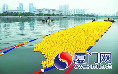 昨日下午,海滄阿羅海廣場上人頭攢動,大家的目光都聚集在海滄湖面上,5萬只小黃鴨被安放在起跑點,長度為300米的直線賽道,終點就在大黃鴨附近。