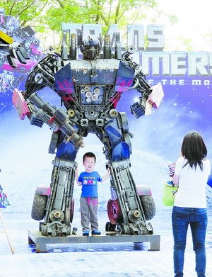 小朋友與變形金剛合影。