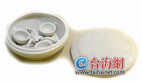 這是宋代的胭脂盒,里面三個(gè)凹槽用來(lái)裝胭脂水粉。用現(xiàn)在的話說(shuō),就是用來(lái)裝眼影、腮紅和口紅?!八未碾僦鄱际侵参锾崛〉?,不同的花可以提煉出不同顏色的胭脂。”湯沛霖說(shuō),這次展出的是定窯月白釉圓蓋盒和龍泉窯青釉圓蓋盒。