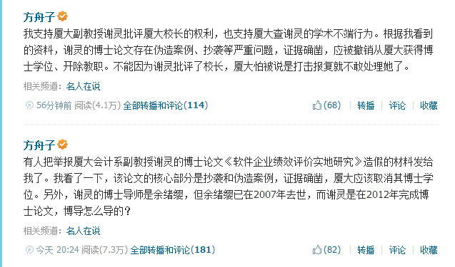 今日,內(nèi)地著名打假人士方舟子在微博公開回應此事,稱支持廈大副教授謝靈批評廈大校長的權利,但謝靈博士論文確實存在偽造案例、抄襲等嚴重問題,應被開除。以下為方舟子微博原文: