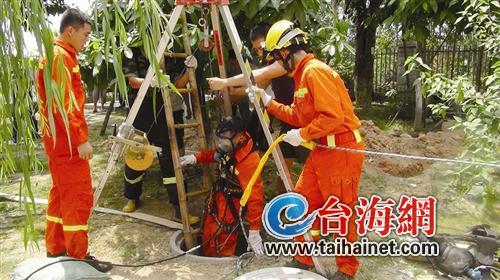 同安潘涂消防中隊(duì)很快到場(chǎng),一個(gè)維修工焦急地坐在井邊。原來(lái),和他一起維修的同事沒(méi)佩戴保護(hù)裝備就下井修理管道,不慎落入井中。