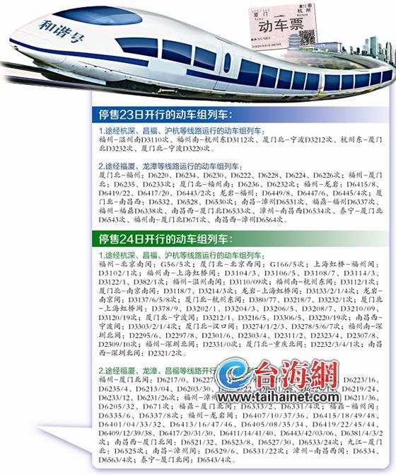 7月23日至24日,福建境內(nèi)杭深、龍漳、漳龍、漳泉等鐵路沿線將有強(qiáng)降雨,受此影響,鐵路部門決定暫停發(fā)售23日34趟、24日87趟途經(jīng)上述鐵路的動(dòng)車組車票(詳見圖表)。